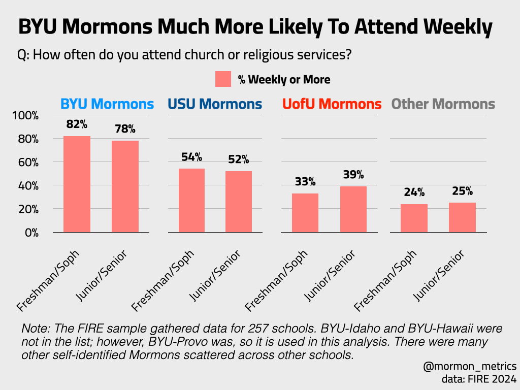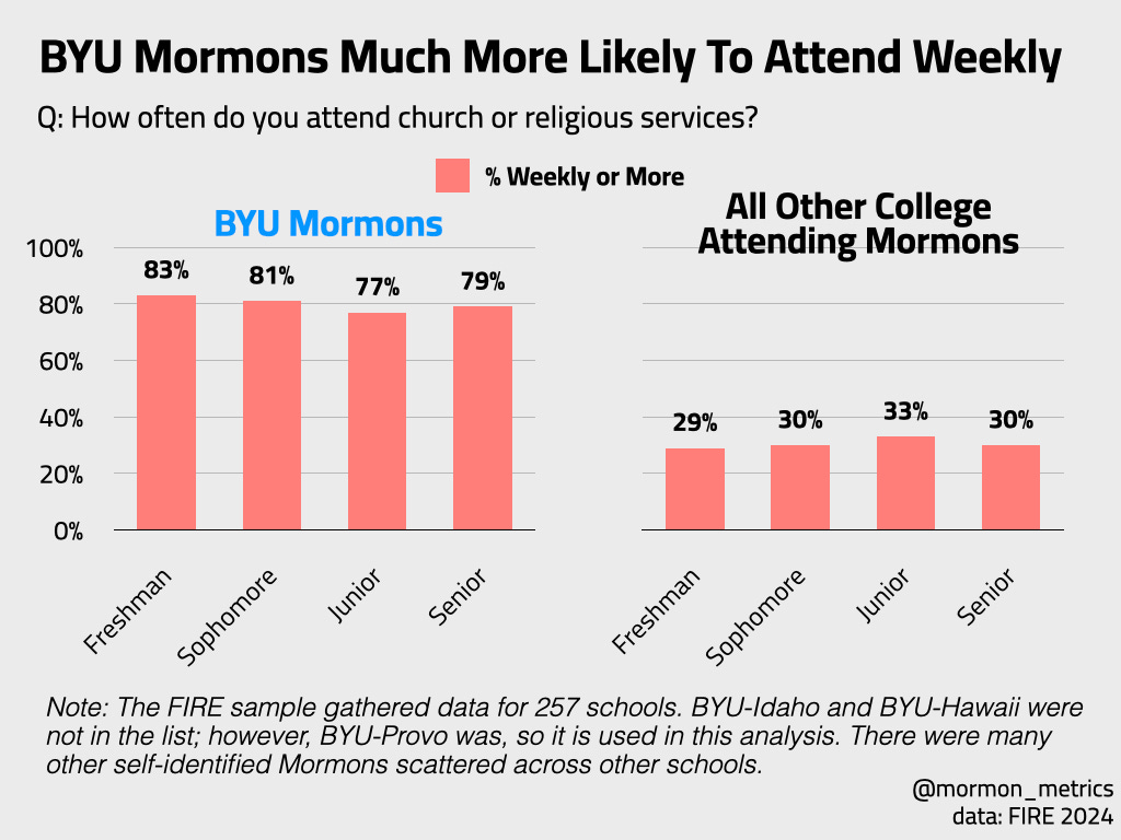 If we are looking at the overall weekly church attendance.. YES. Mormons at BYU have a really high weekly church attendance rate and much higher than Mormons at USU, UofU, and other colleges combined.