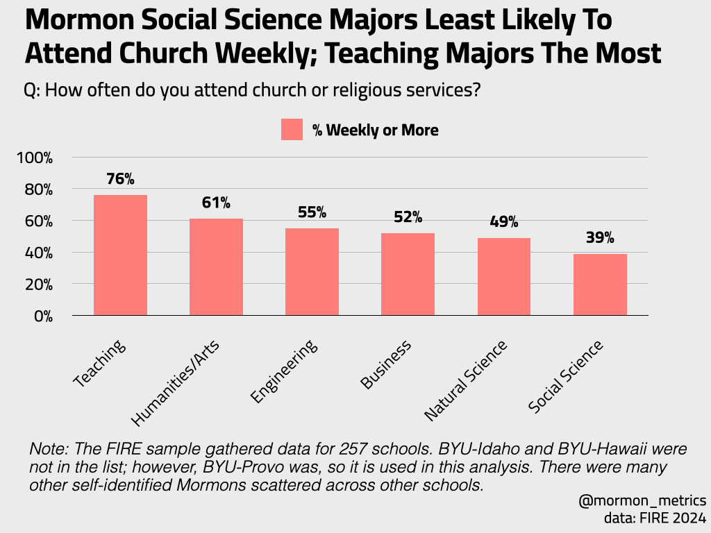 There are some differences by college major with Mormon church attendance. Social science and natural science majors least likely to attend weekly; humanities, arts, and teaching majors most likely to attend.