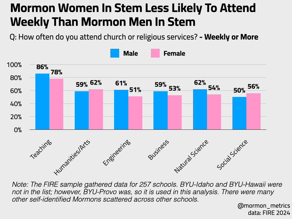 This supports our last post which saw a democratic shift most pronounced in Stem women and social science men. Well in this post, we see that mormon women in stem (engineering, business, and natural science) are less likely to attend church weekly or more, but are more likely to attend than the social science and humanities men. And, of course, there is a connection between identifying as democrat and leaving the mormon church (which would mean lower attendance!)