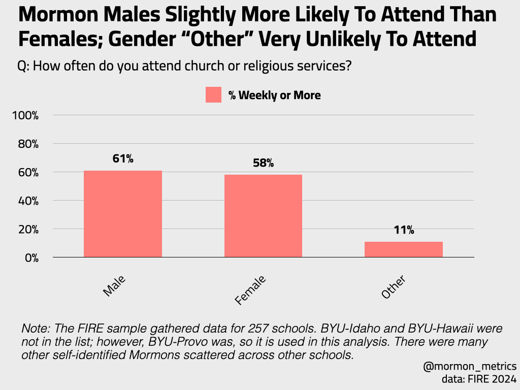 When looking by gender, we see something that confirms previous findings - that mormon women are slightly less likely to attend church weekly or more. Those who identify as non-binary or other are very unlikely to attend church weekly or more.