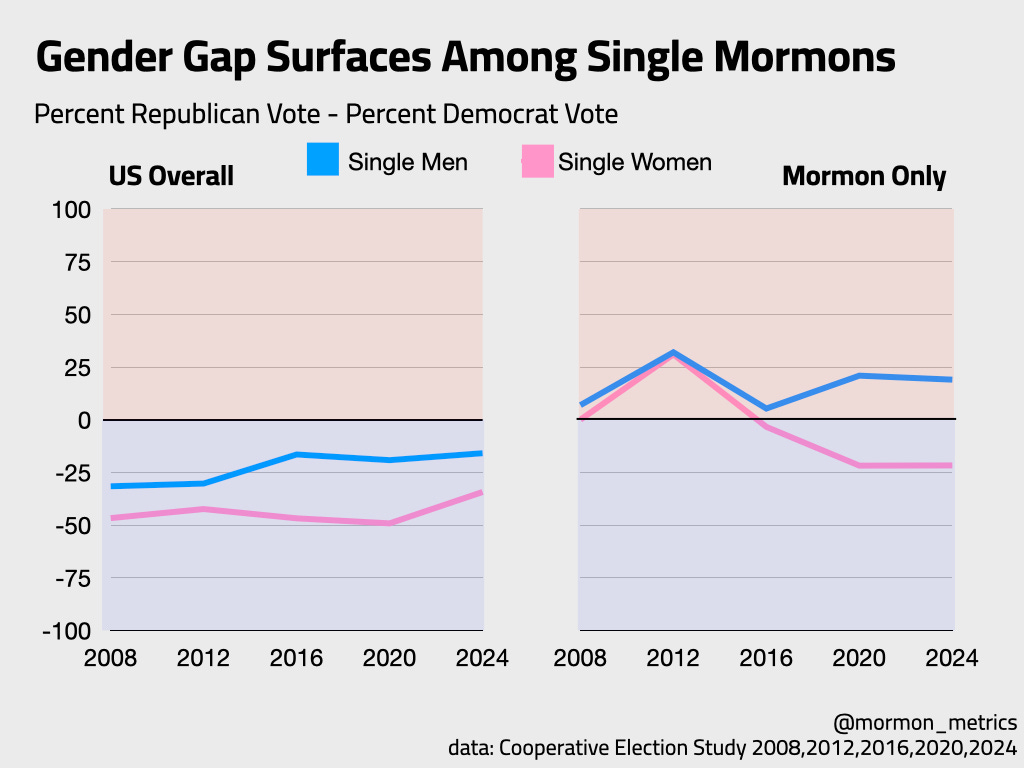 One last Trump era gap, I’ll point out is the Mormon single gender gap. Recently in the US, there has been more of a gender gap among young people in the US. Now we are starting to see it among single, never married Mormons.