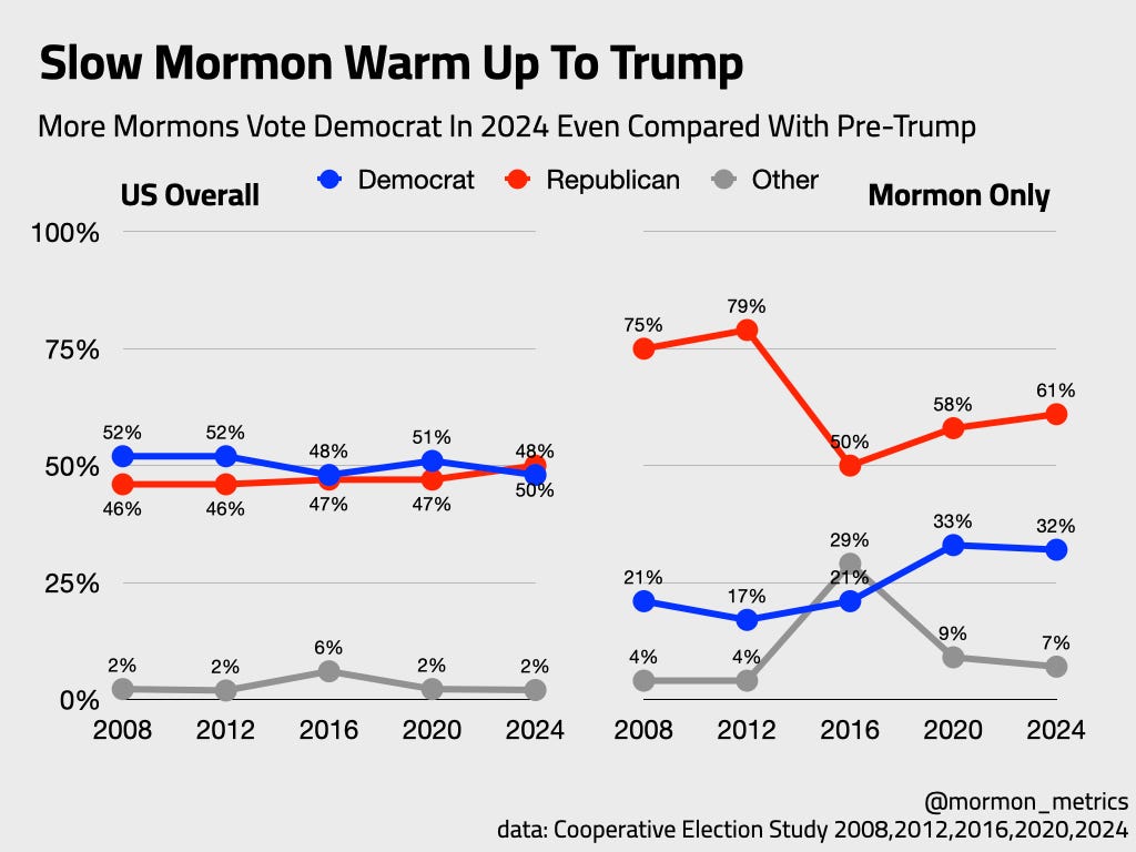 The Mormon vote seems to be slowly warming up to Trump in now the 3rd Trump election (+11 points 2016 → 2024).