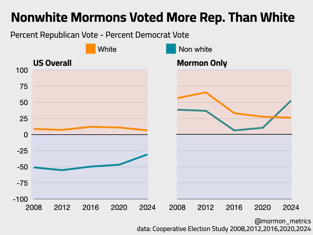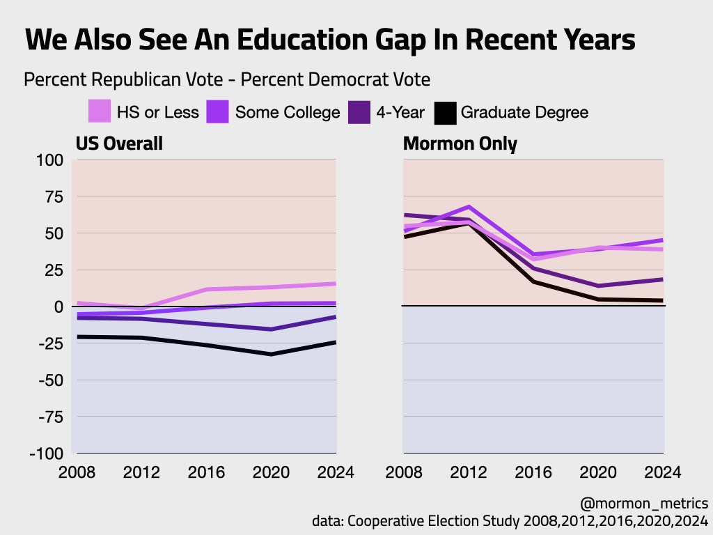 More Mormons are voting Democrat - even compared to the Pre-Trump era in 2008 Obama v McCain. As you can see from 2008 to 2016, there was a 25 point drop in the Republican vote and only 11 Republican points have recovered since. So with also a 11 point rise in the Mormon Democratic vote since 2008, it is suggestive that many of our 2016 McMullin voters have now joined the Democrats in 2020 and 2024.