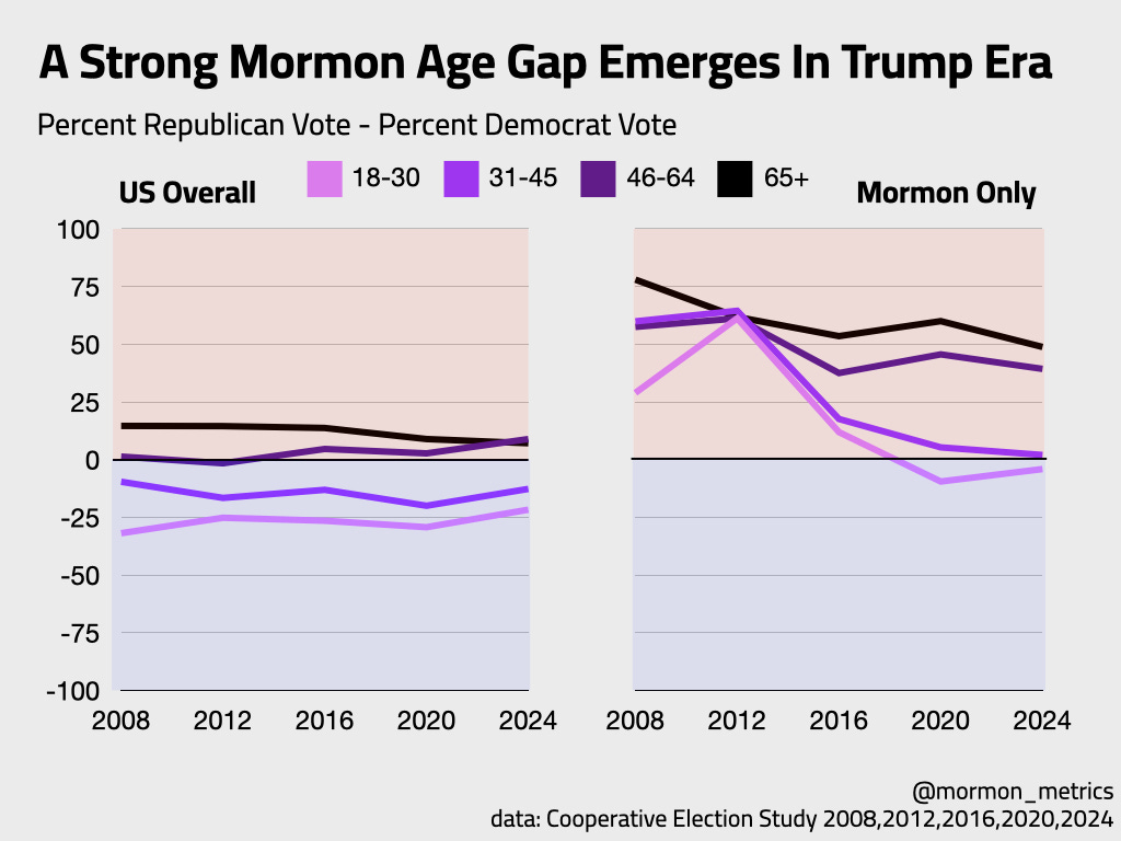 Age has become a large factor in Mormon politics. One interesting thing about the Romney election in 2012 was that he defied the age gap of the Mormon vote. He found strong support across age groups - notably the youngest one 18-30. Since Trump, the Mormon vote age gap has returned and is even more drastic than before and more drastic than the age gap in the US population.