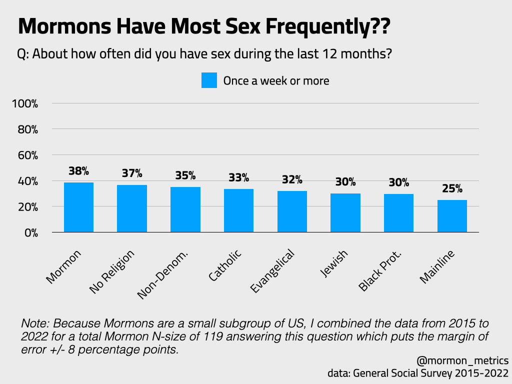 Yes, looking at data combined from 2015 - 2022, Mormons were the most likely group to report having sex once a week or more. Does this surprise anyone?