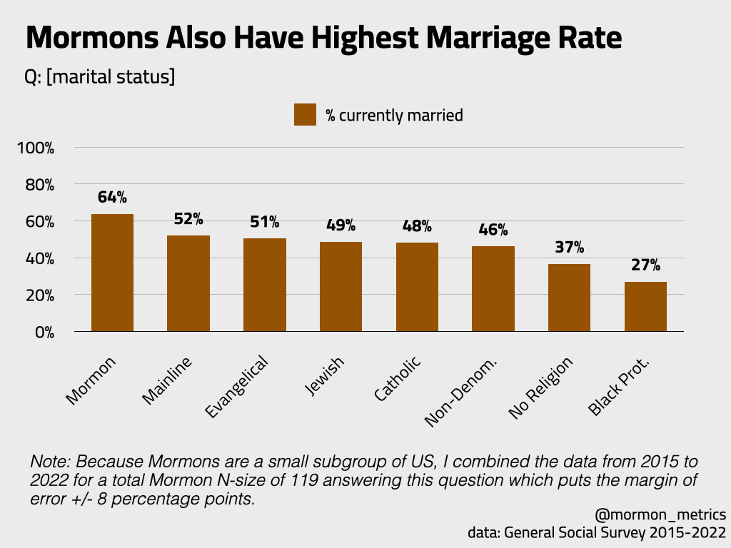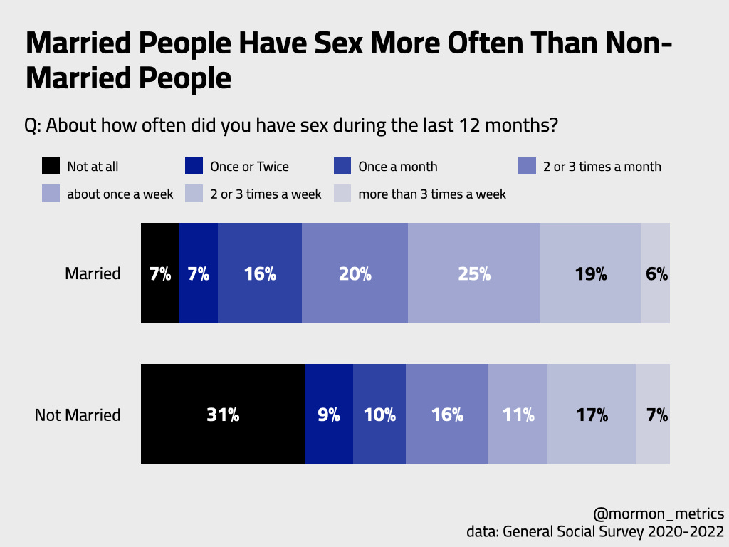 But, remember, many Mormon members also strictly follow the law of chastity which forbids sexual relations outside of marriage. And the question is not limited to one partner. It asks how often the respondent has sex with any partner. So, there will be some count among non-Mormon singles that likely will not be as high for Mormon singles. With this in mind, how can it be that overall Mormons are having sex most frequently?