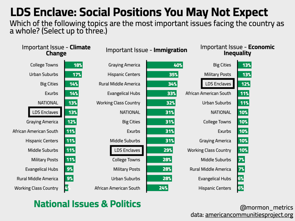 Also, economic inequality is typically an issue focused on by democrats, but we see high numbers for the LDS Enclave and double what we see for Evangelical Hubs.