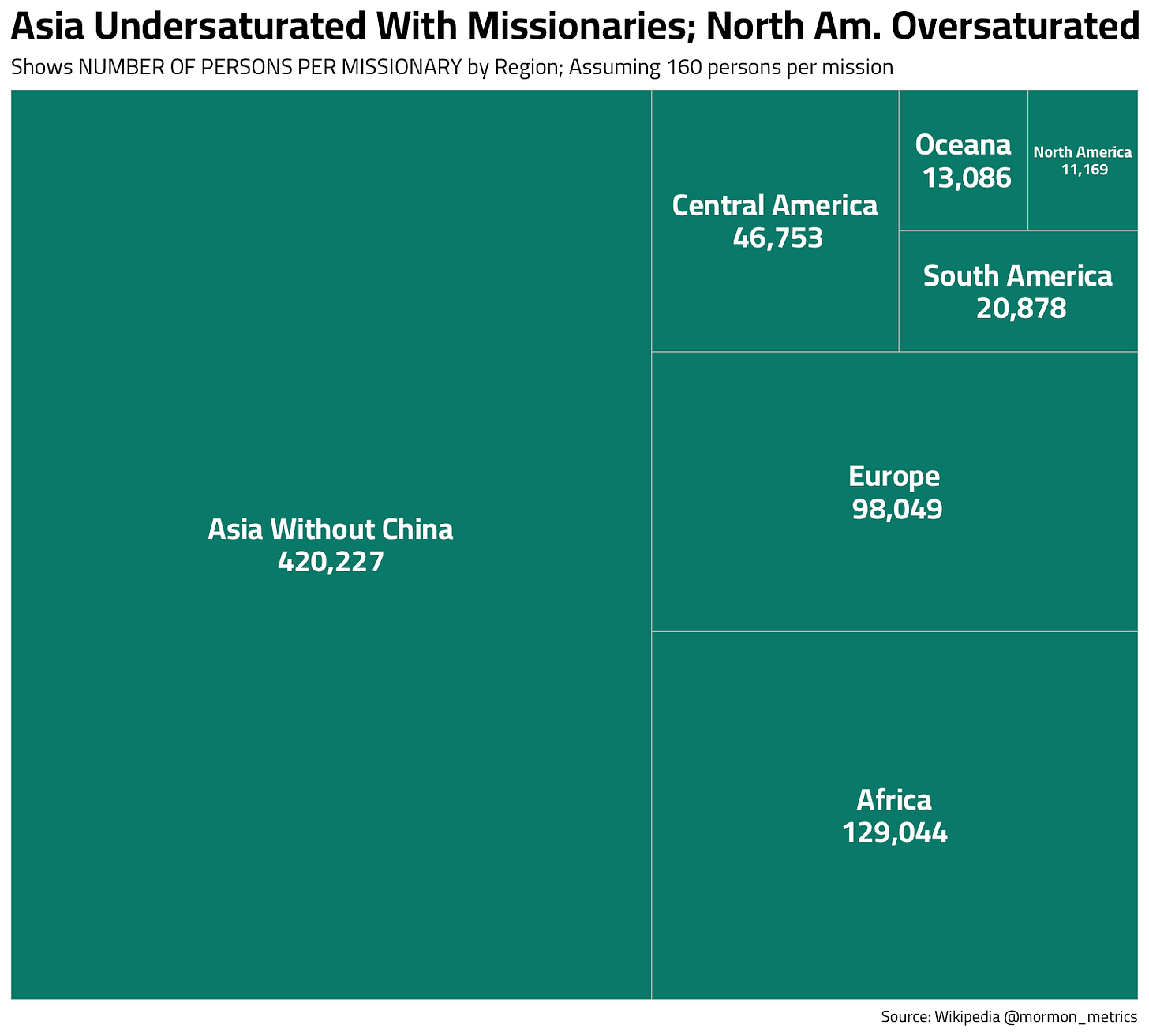 Interestingly in North America, there is a missionary for every 10,000 people. But, in Asia (even excluding china) there is only 1 missionary for every 420,000 people. This is a huge difference! Interestingly, South America is almost twice as saturated with missionaries per capita than Central America. There are also many more people than missionaries in Europe and Africa comparatively to other regions