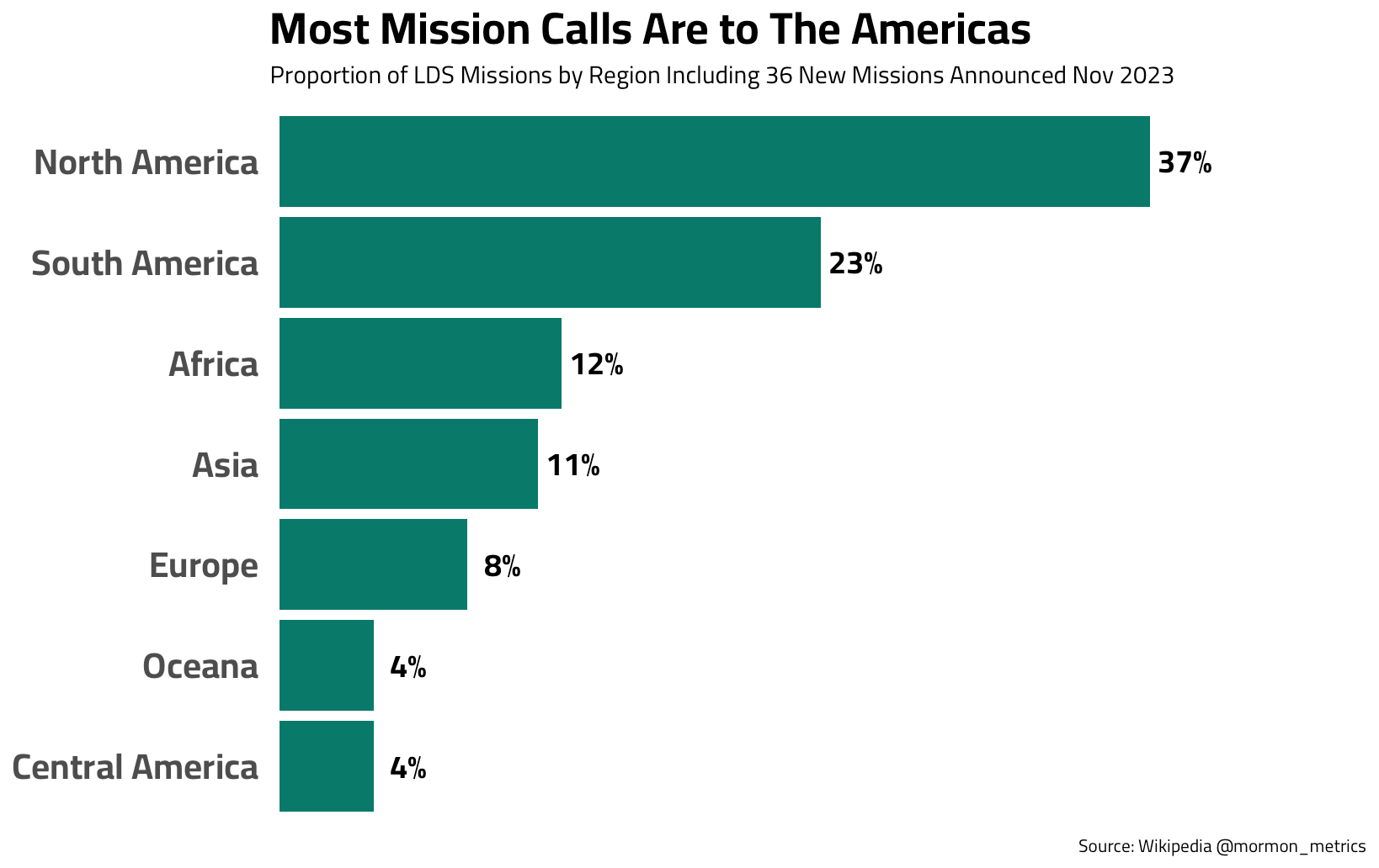 Looking at this figure, almost 2 in 3 missionaries are called to somewhere in the Americas (assuming an equal number of missionaries per mission). The fewest missionaries are sent to Oceana, Europe, and Asia.