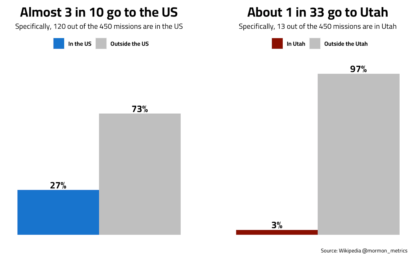 For whatever reason, when I was a missionary in Utah, I used to tell people that 1 in 12 missionaries get called to Utah. It was just what I had heard passed around and what I told people I talked to. However, this is clearly quite wrong as only 1 in 33 go to Utah which is a few times less likely than I claimed