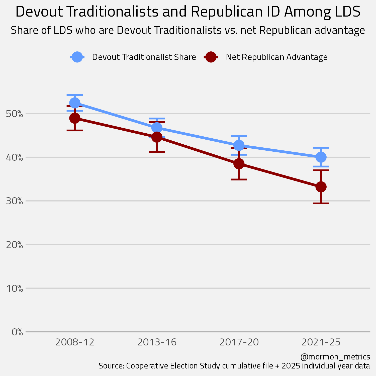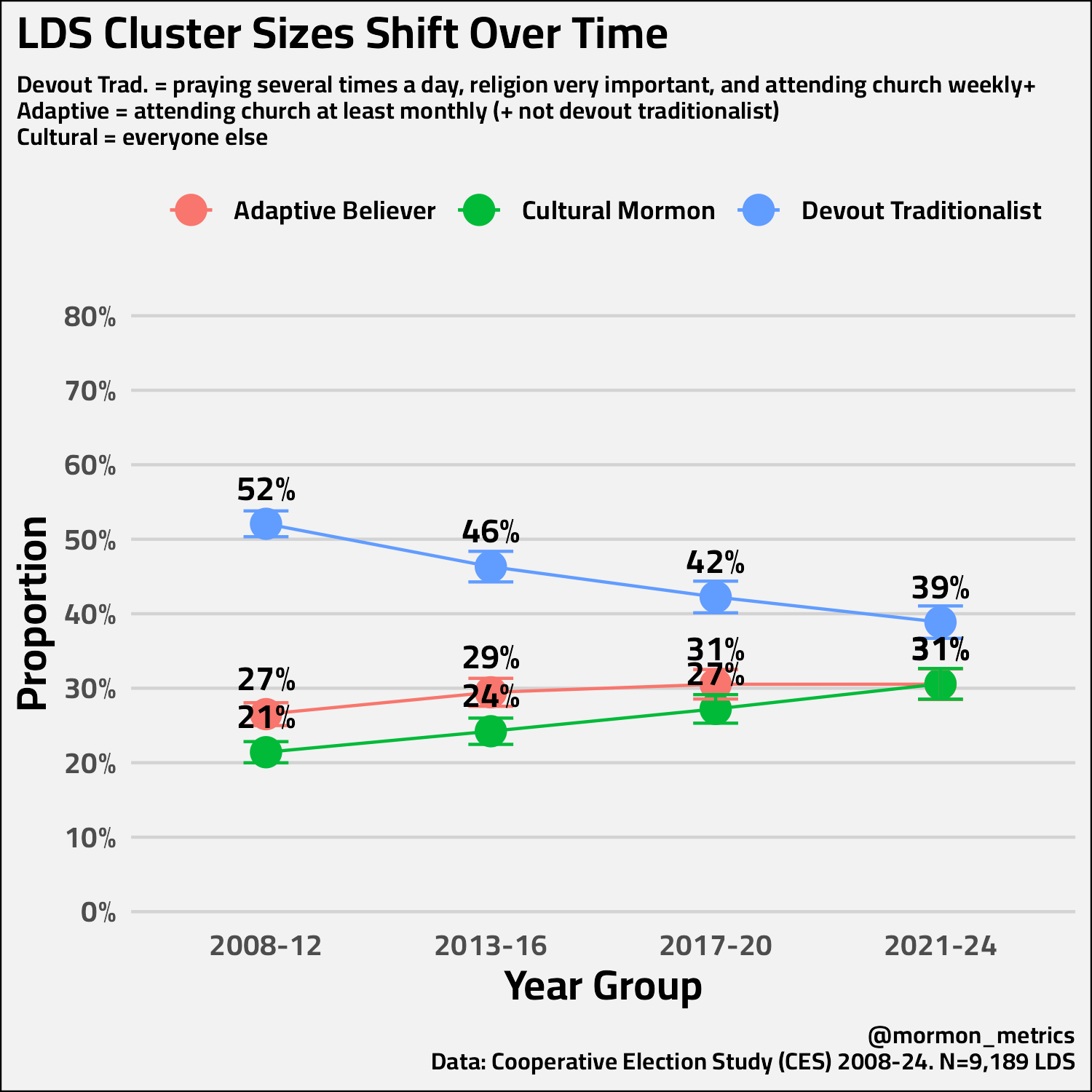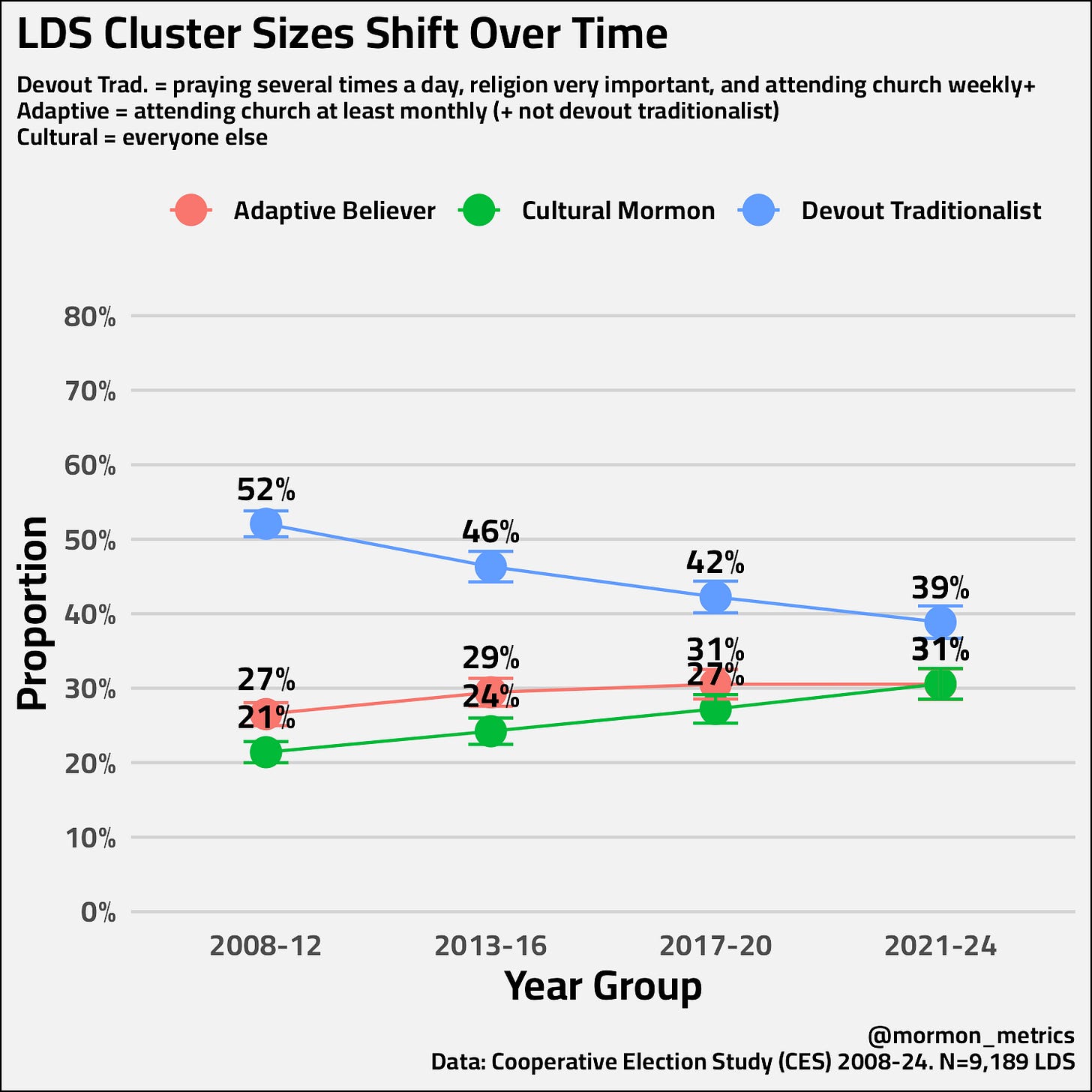 One answer is composition. The share of LDS respondents who qualify as Devout Traditionalists has declined steadily — from 52% of the LDS sample in 2008-12 down to just 39% by 2021-25. Meanwhile Cultural Mormons have grown from about 21% to 31%.