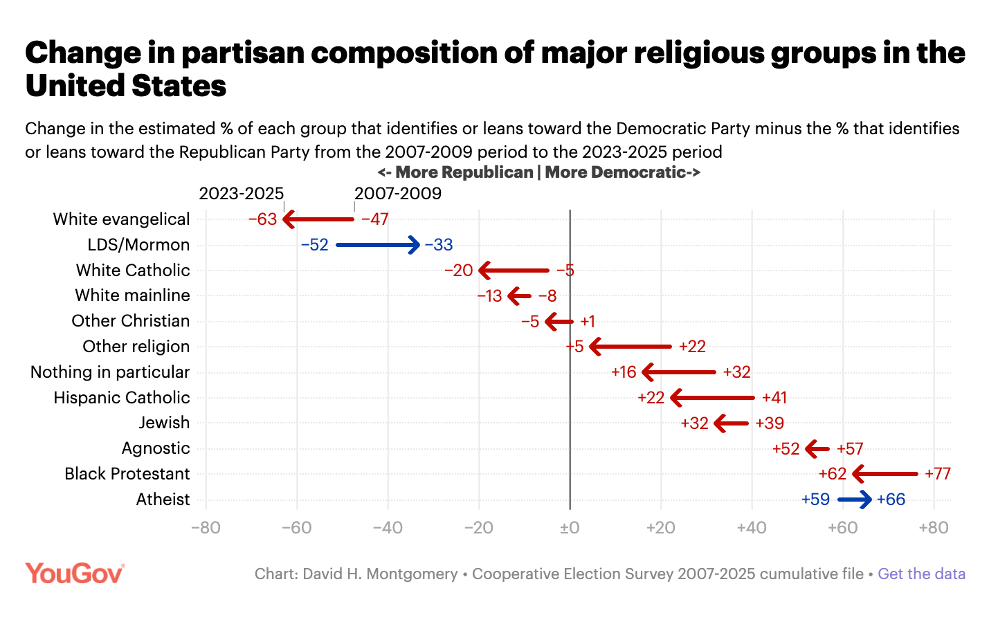 YouGov released a report last week with a striking chart. Throughout the period from 2007 to 2025, Latter-day Saints shifted nearly 20 points toward the Democratic party while nearly every other religious group shifted right. They went from the most Republican religious group in America to the second most Republican, moving in sharp opposition to White Evangelicals who continued consolidating around the GOP.