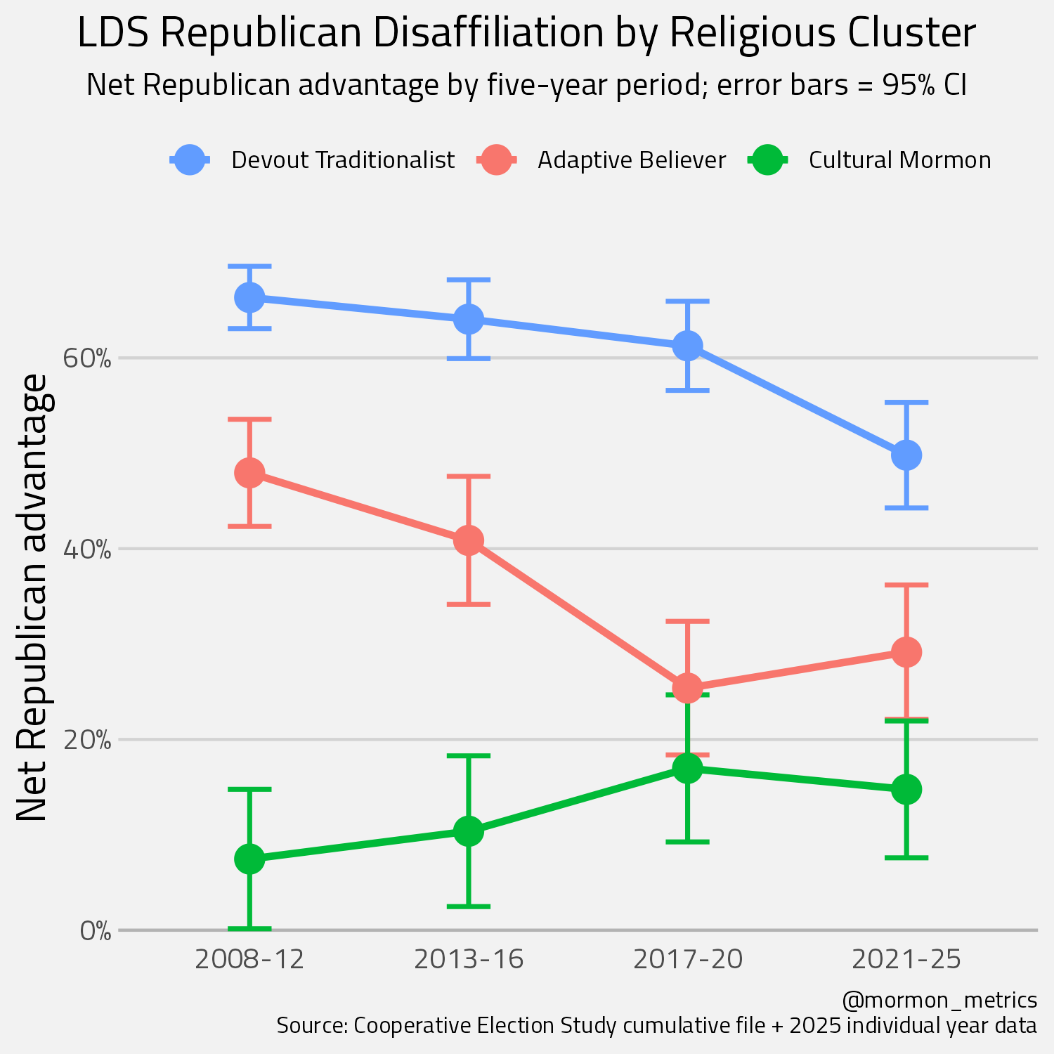 Cultural Mormons are essentially flat throughout the entire period — hovering around 10-15% net Republican advantage regardless of what’s happening in the broader political environment. They were never strongly Republican and haven’t changed. That’s consistent with the compositional story.