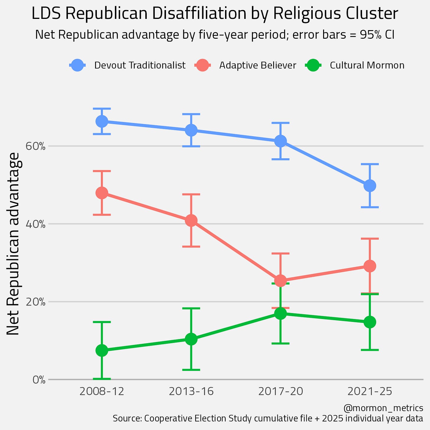 Second, partisan dealignment. Even among high-practice members who are classified as Devout or Adaptive, the Trump era appears to have created some friction with their Republican identification. Their values and policy views may not have changed. But the Republican party’s direction under Trump conflicted enough with LDS cultural norms — civility, institutional trust, character in leadership — that some members stopped calling themselves Republicans even while remaining ideologically conservative.