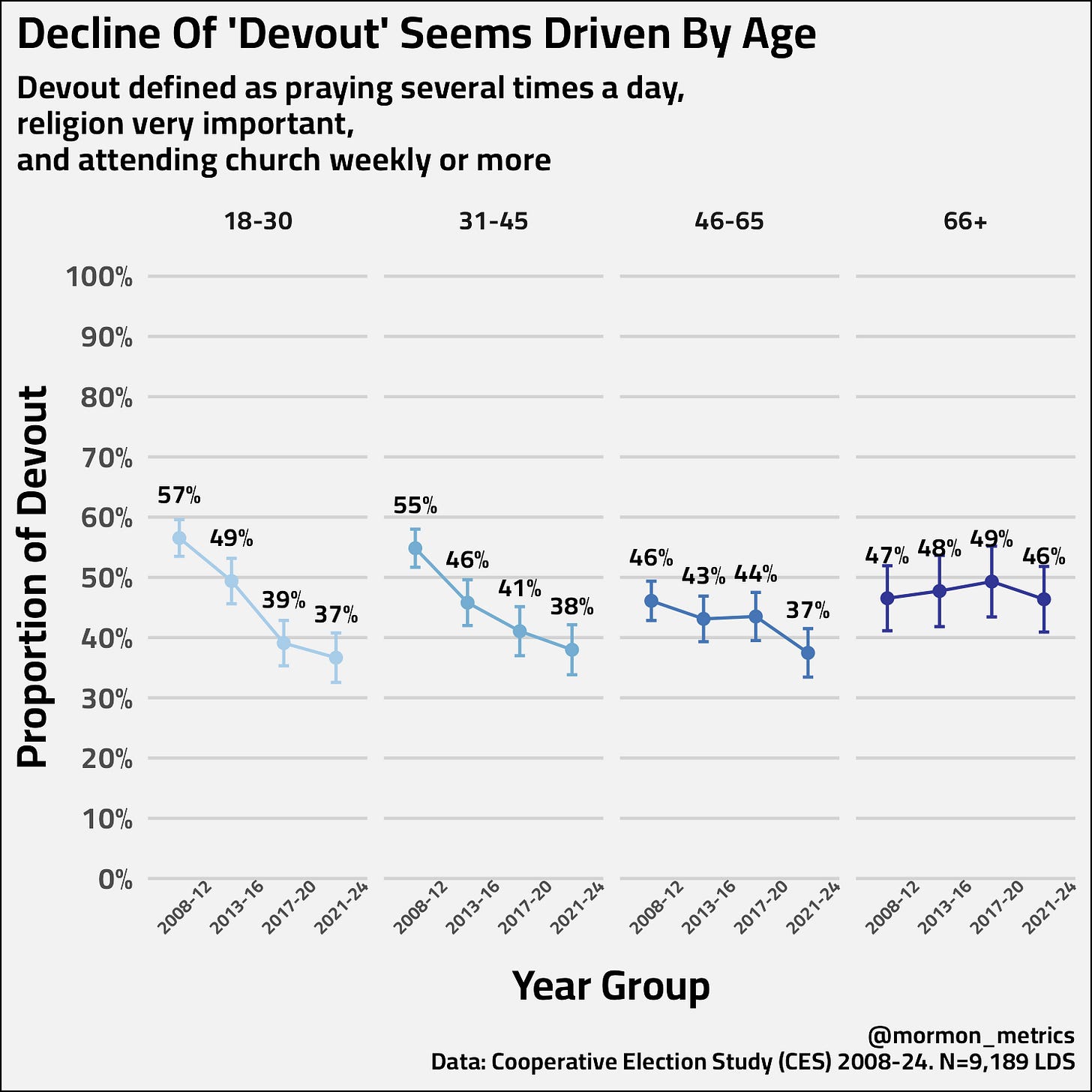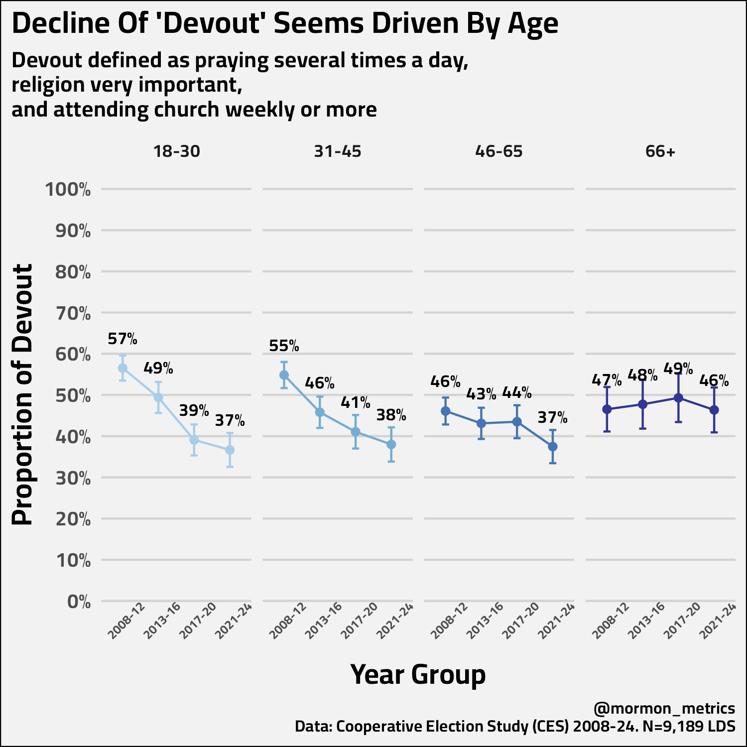 Look at these two charts side by side (both from previous Mormon Metrics analyses). The first shows the Mormon age gap in voting — young Mormons collapsing toward Democrat post-2016 while older Mormons hold their Republican vote. The second shows the Mormon age gap in religious engagement — young Mormons losing Devout status fastest while older Mormons hold steady.